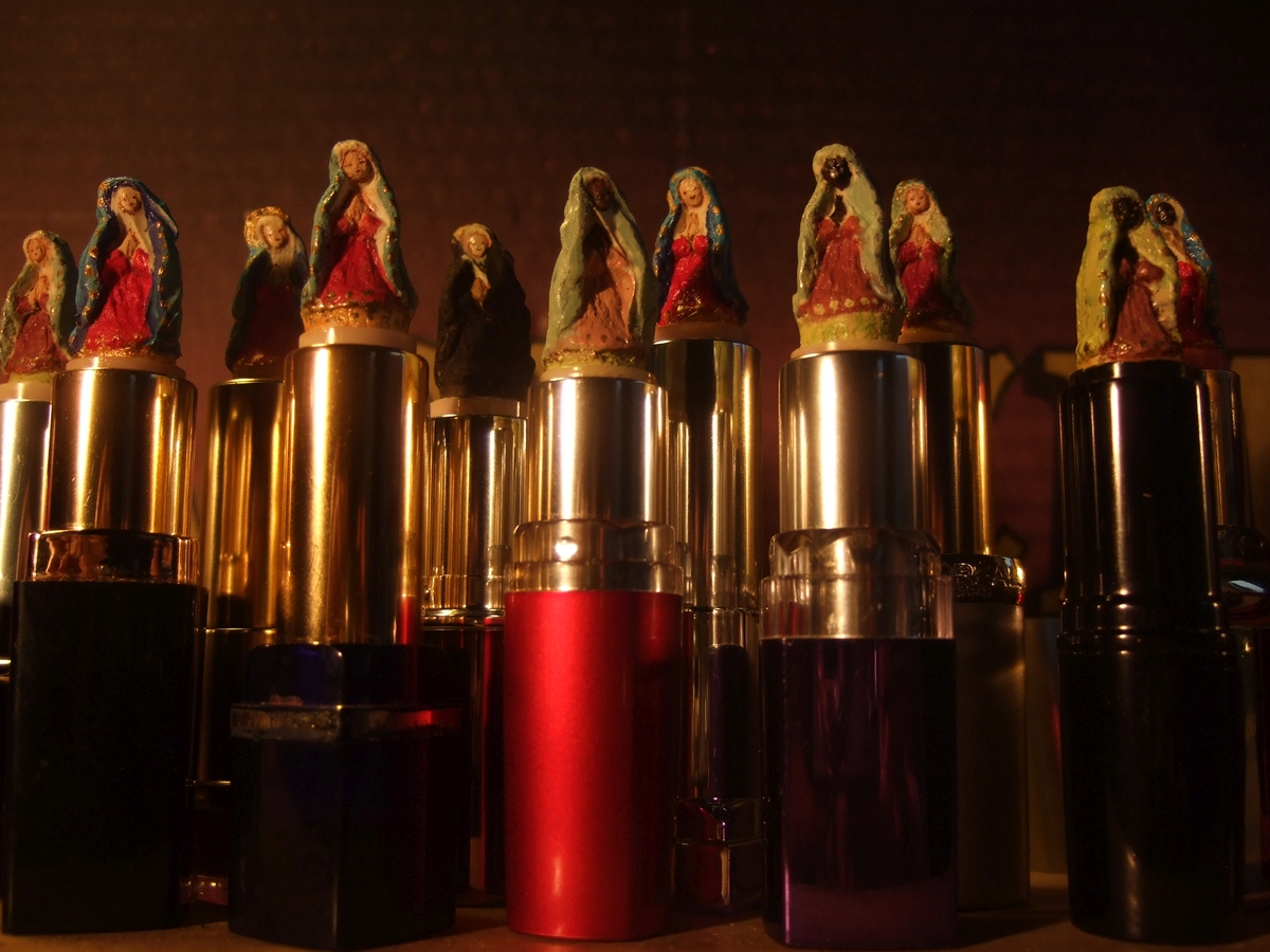 Die Madönnchen sind von mir geformt und dann einzeln gegossen, geschliffen, bemalt und in verbrauchte Lippenstifthüllen geklebt, die meine Freundinnen für mich sammeln.